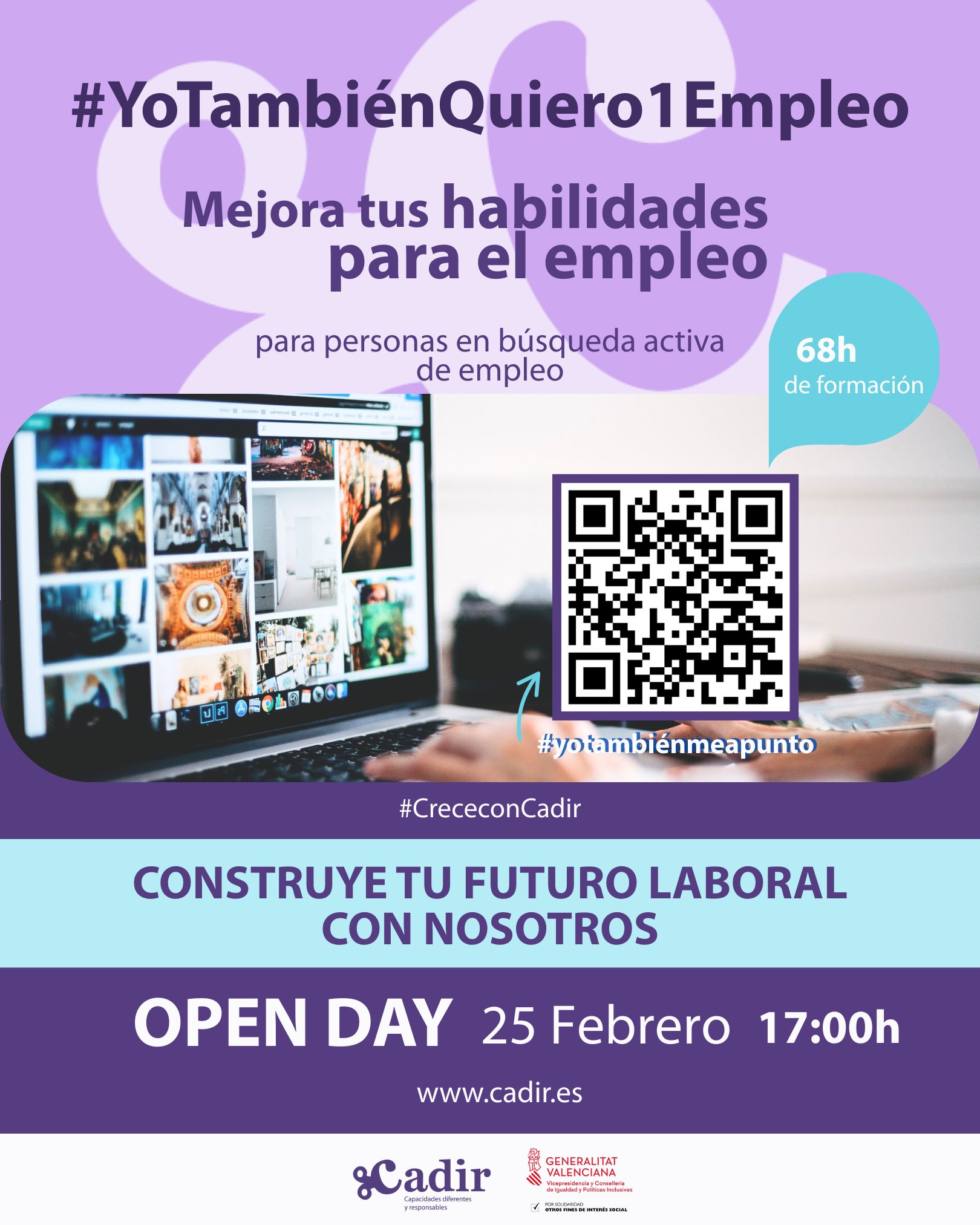 Desde la Asociación CADIR te invitamos a la jornada de Open Day del programa #YoTambiénQuiero1Empleo, un programa de inclusión sociolaboral dirigido a personas en situación de vulnerabilidad en la Comunitat Valenciana.